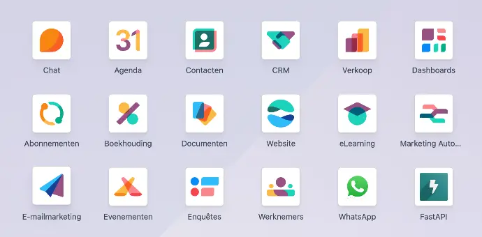 Odoo werkt met modules. Elke module ondersteunt een specifiek bedrijfsproces, zoals facturatie, CRM of voorraadbeheer. Je start met de modules die je vandaag nodig hebt en breidt later uit wanneer je bedrijf groeit.